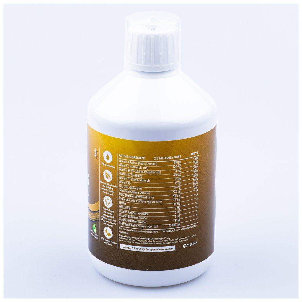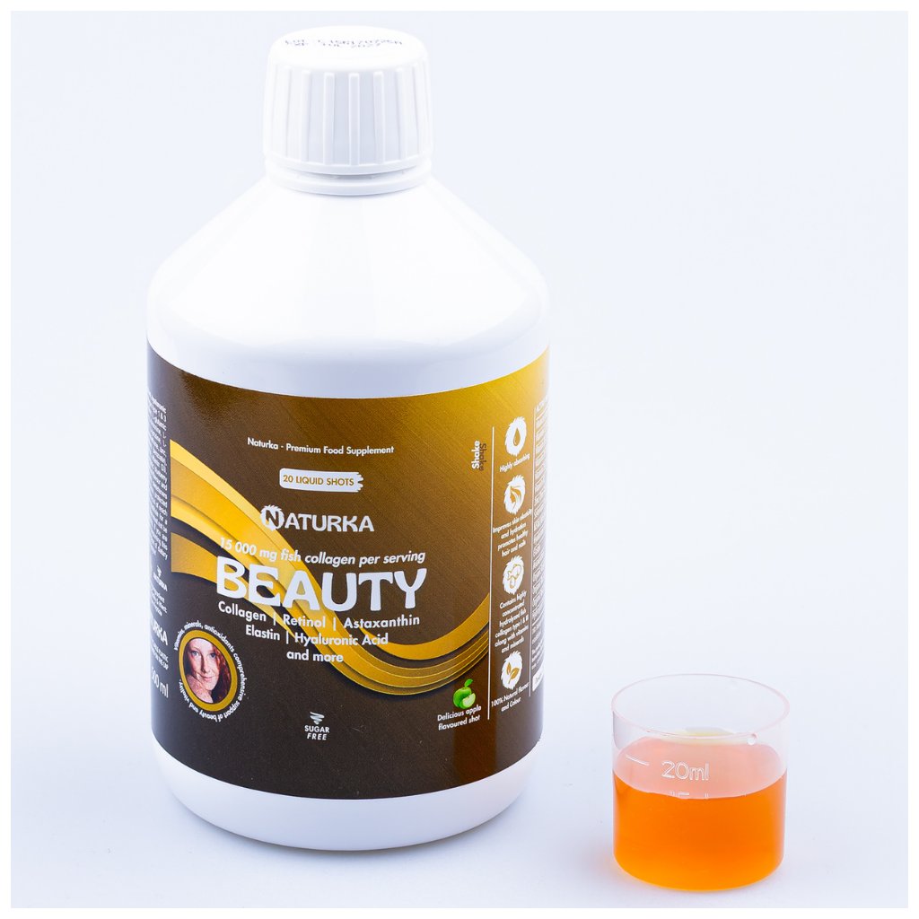 Naturka BEAUTY obsahuje vysoko koncentrovaný tekutý morský kolagén s obsahom až 15 000 mg kolagénu v jednej dávke, obohatený o kyselinu hyalurónovú, elastín, astaxanthín a vitamíny pre komplexnú podporu krásy.